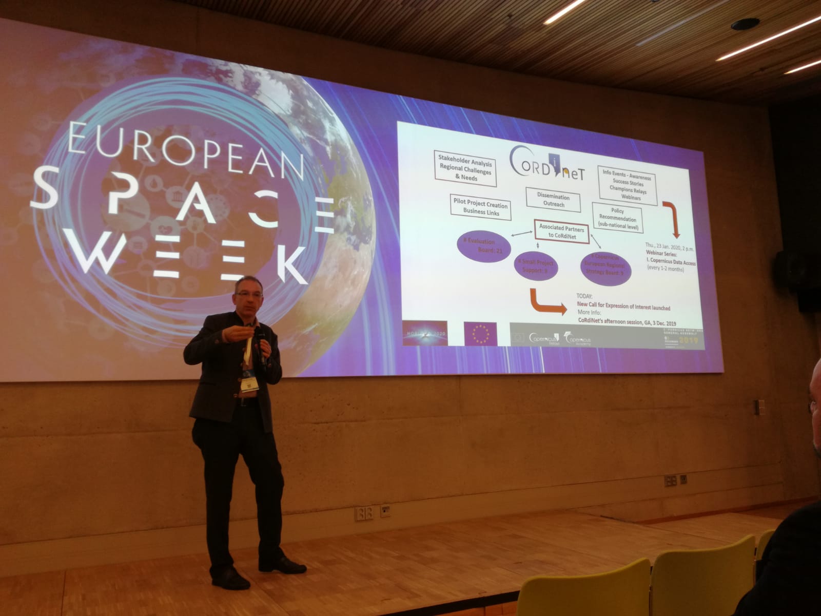 Project coordinator Jürgen Vogel presents the CoRdiNet project at the EU Space Week.
