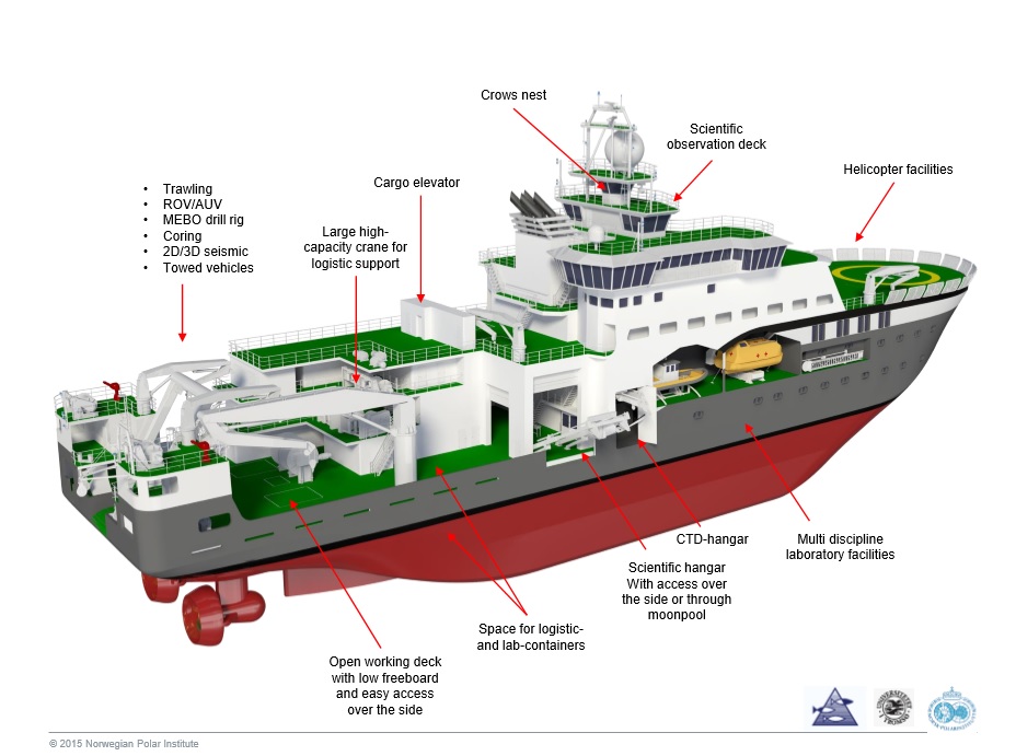 RV "Kronprins Haakon" will have a cruising speed of 15 knots and be capable of breaking through ice up to one metre thick. The Kronprins Haakon has been built to operate in challenging ice conditions, which means it can go further north and south than any other Norwegian research vessel. It is equipped with the very latest high-tech equipment, enabling us to perform more complex studies.