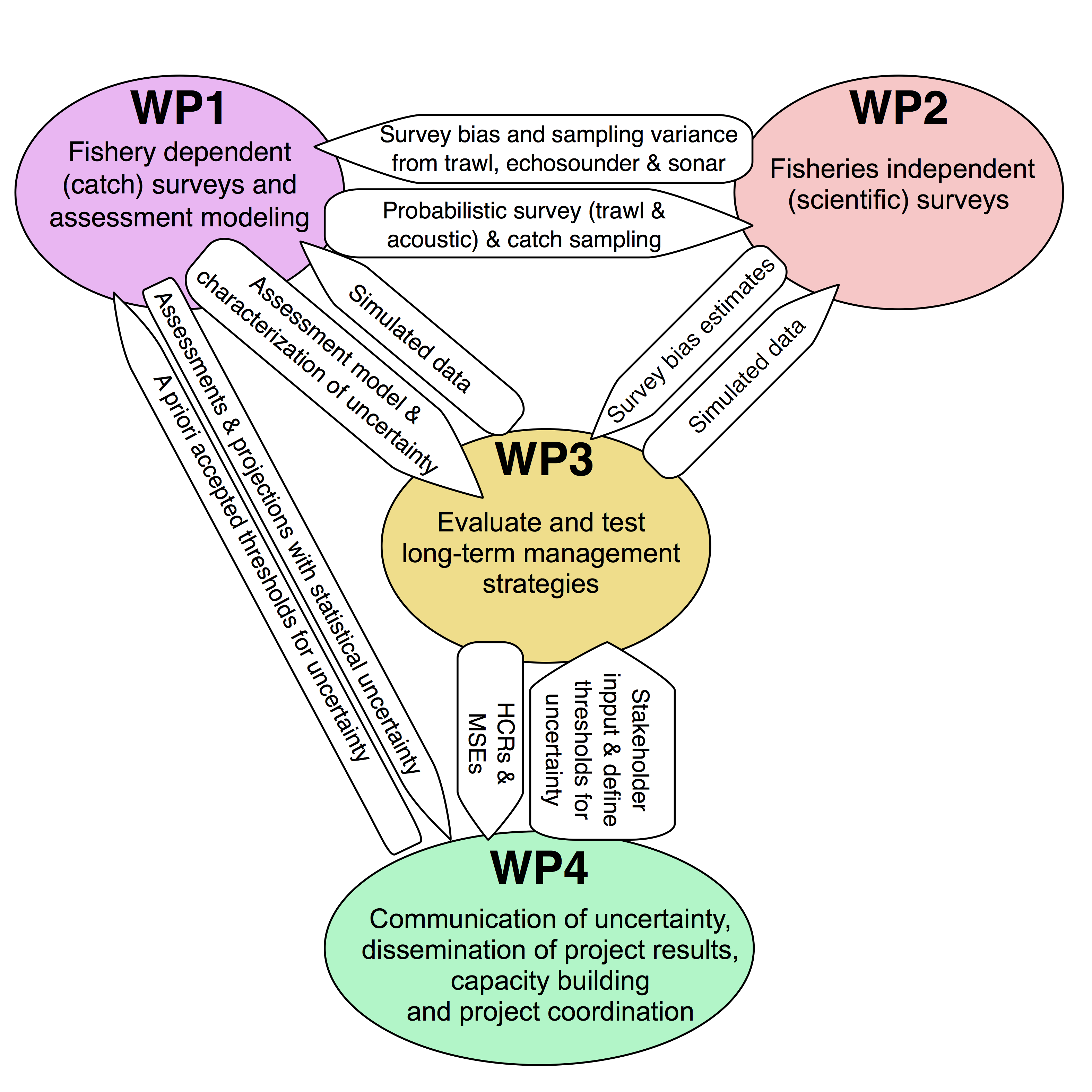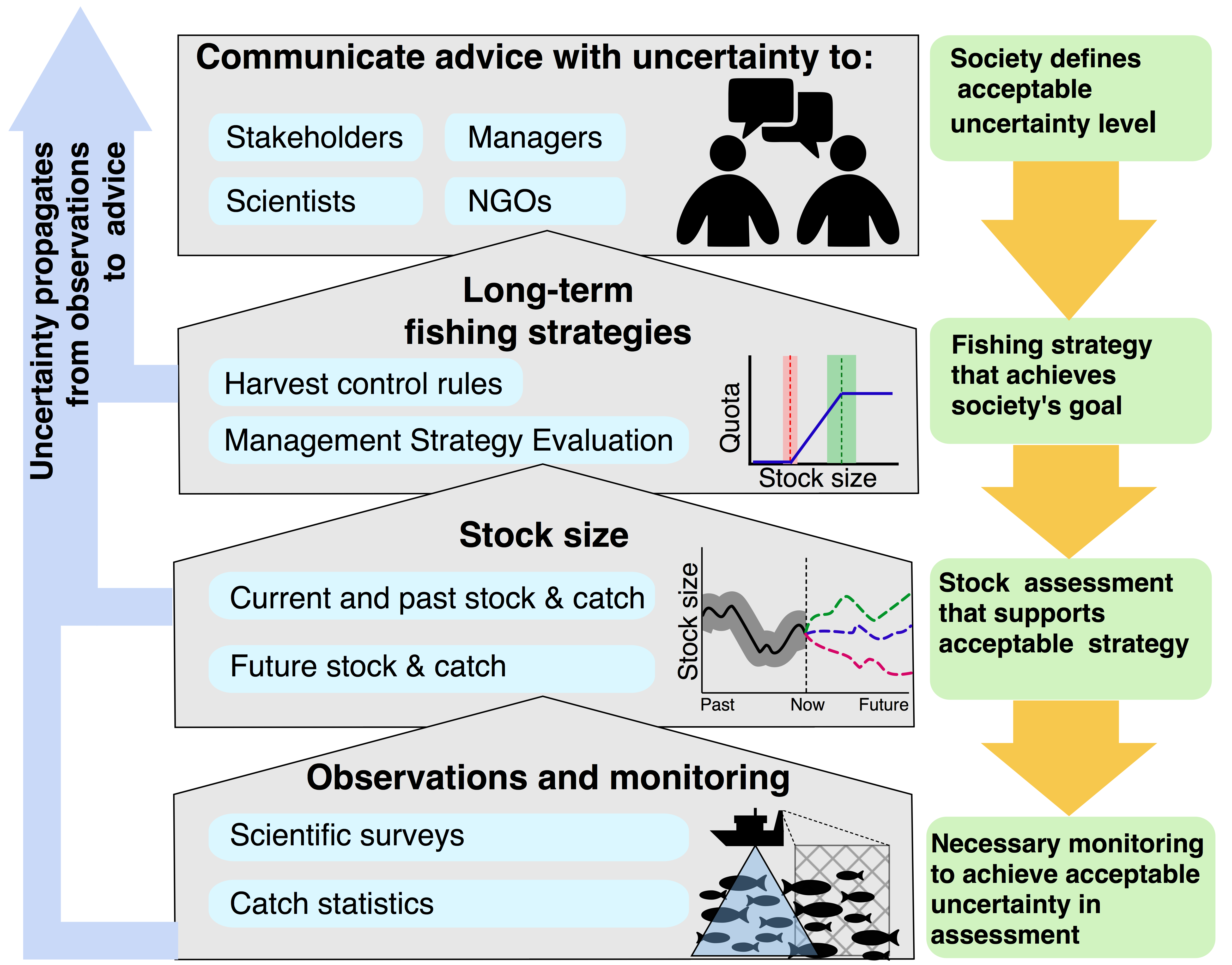 The REDUS project will use both a bottom-up approach (from observations through management) and a top-down (society’s uncertainty requirements implications for observations). Thus REDUS will provide society with knowledge of how uncertainty affects stock assessment and hence quota advice, and complementary how much catches can increase if we reduce this uncertainty.